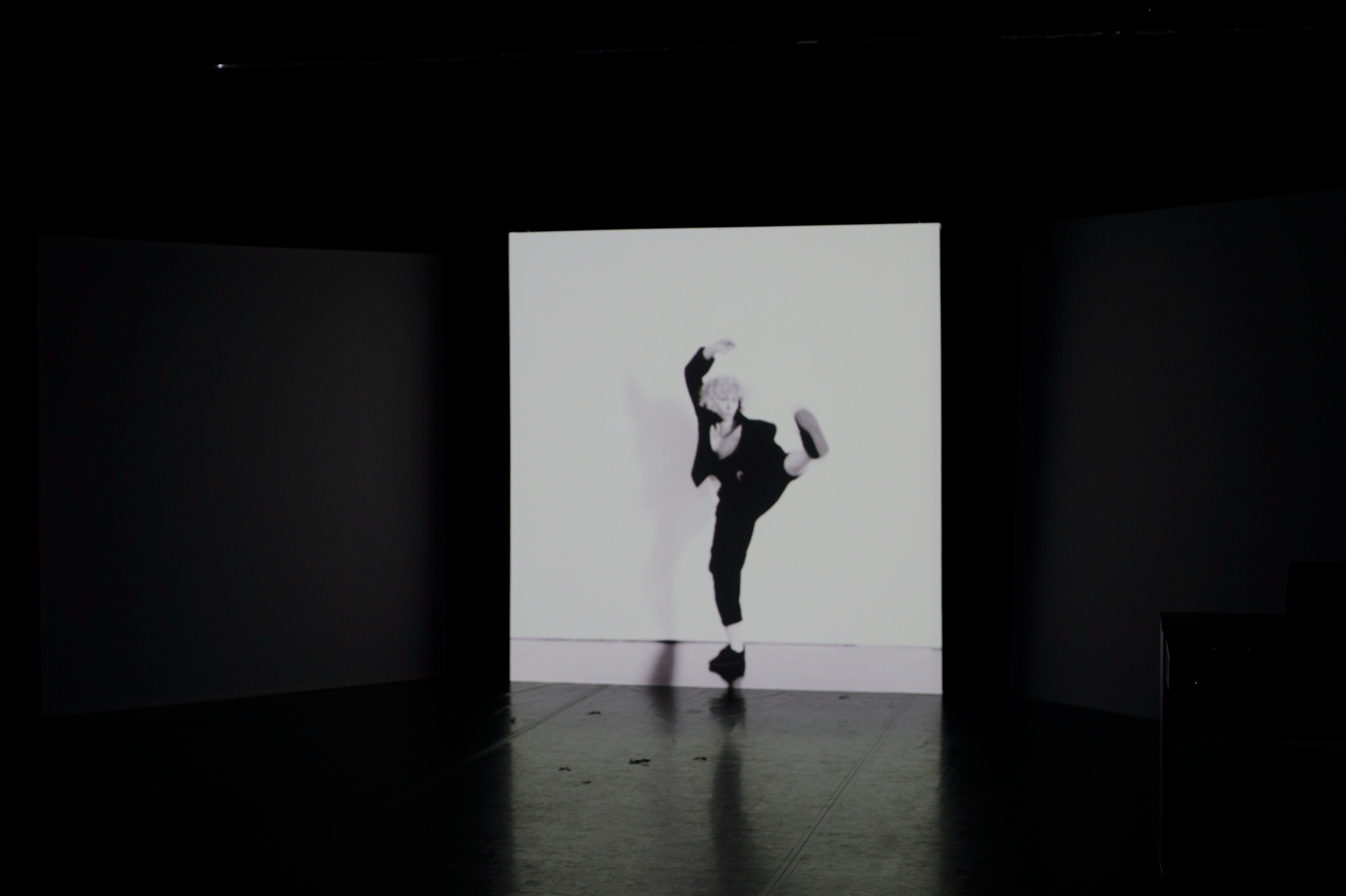 Simultanément, une vidéo fait apparaître les lettres de la typographie graphique projetées sur un des murs de la gallerie. Le spectateur peut suivre la correspondance entre la lettre dansée et la lettre de la typographie. Cette police de caractère est la police « manteau noir », car à chaque changement de police (en futur projet) la correspondance humaine s’incarne dans le changement de vêtement.