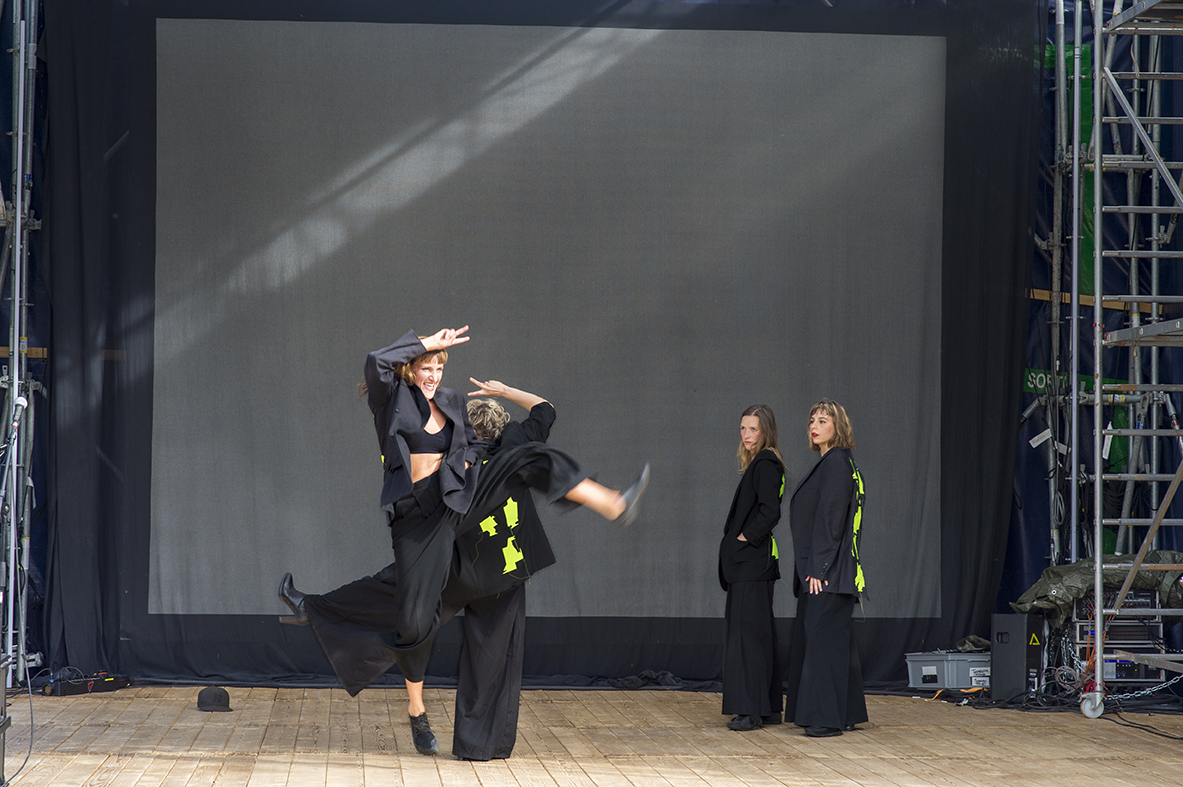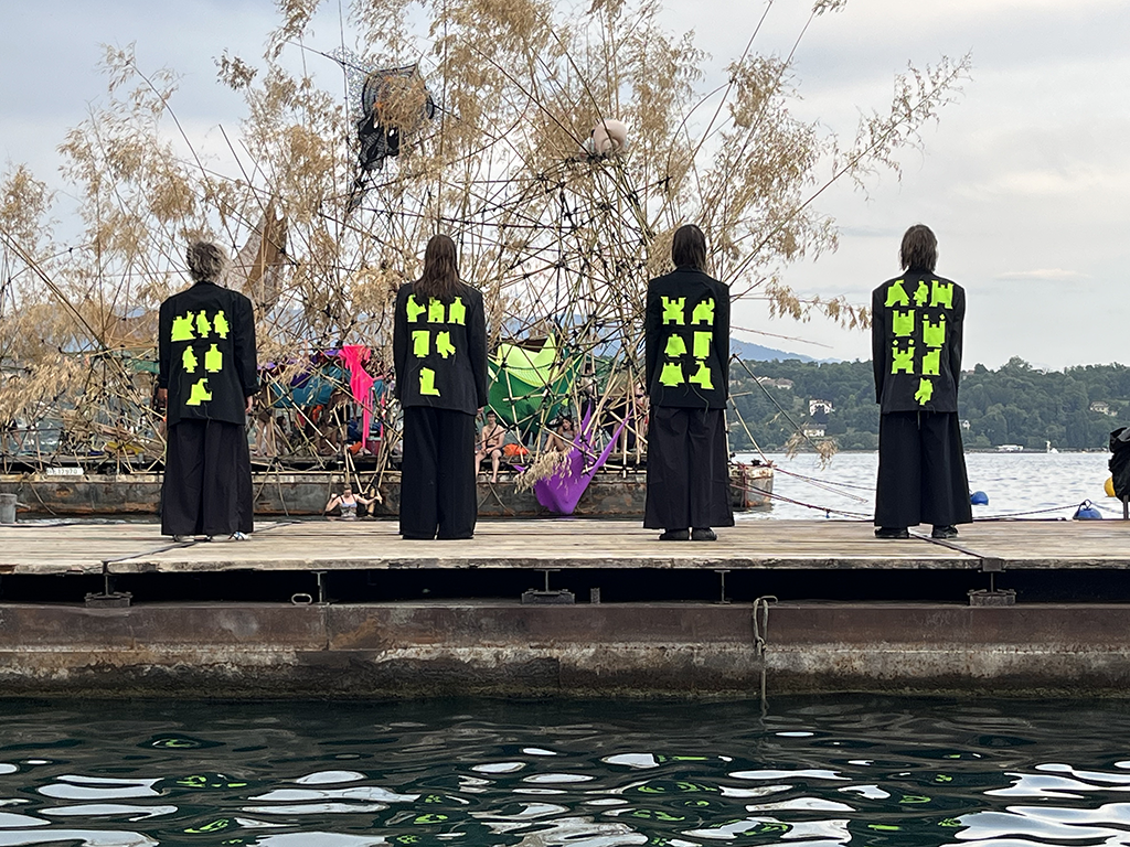 En juillet 2023, lors de la BIG 5ème biennale des espace d’art indépendants de Genève, nous avons joué à la Perle du Lac, où se tenait l’événement. Nous avons joué sur scène terrestre et scène lacustre la chorégraphie issue du kata de A à Z sur une base similaire à celle de “What’s important to say”, performance détaillée ci-dessous. Les lettres ont été cousues par Cerise Rossier sur des vestes de costard, donnant un aspect plus punk à l’ensemble.